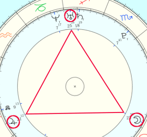 この安定した三角形は、トライン(120度)という幸運アスペクトによって形作られてます。
